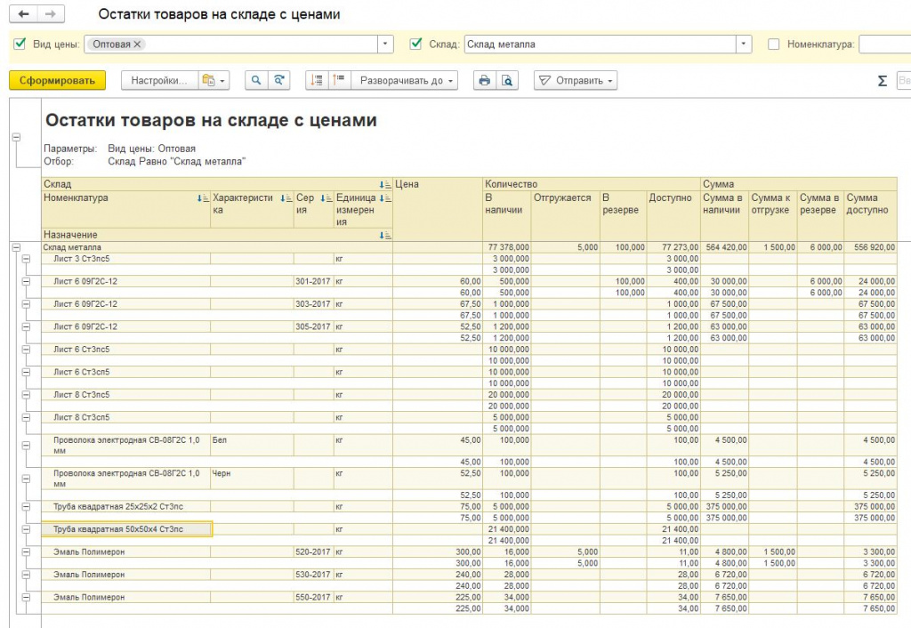 остатки и доступность товаров цена сумма серии