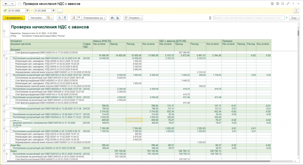 Отчет для конфигурации БП 3, который позволяет проверить правильность начисления и зачета авансов для разных ставок НДС.