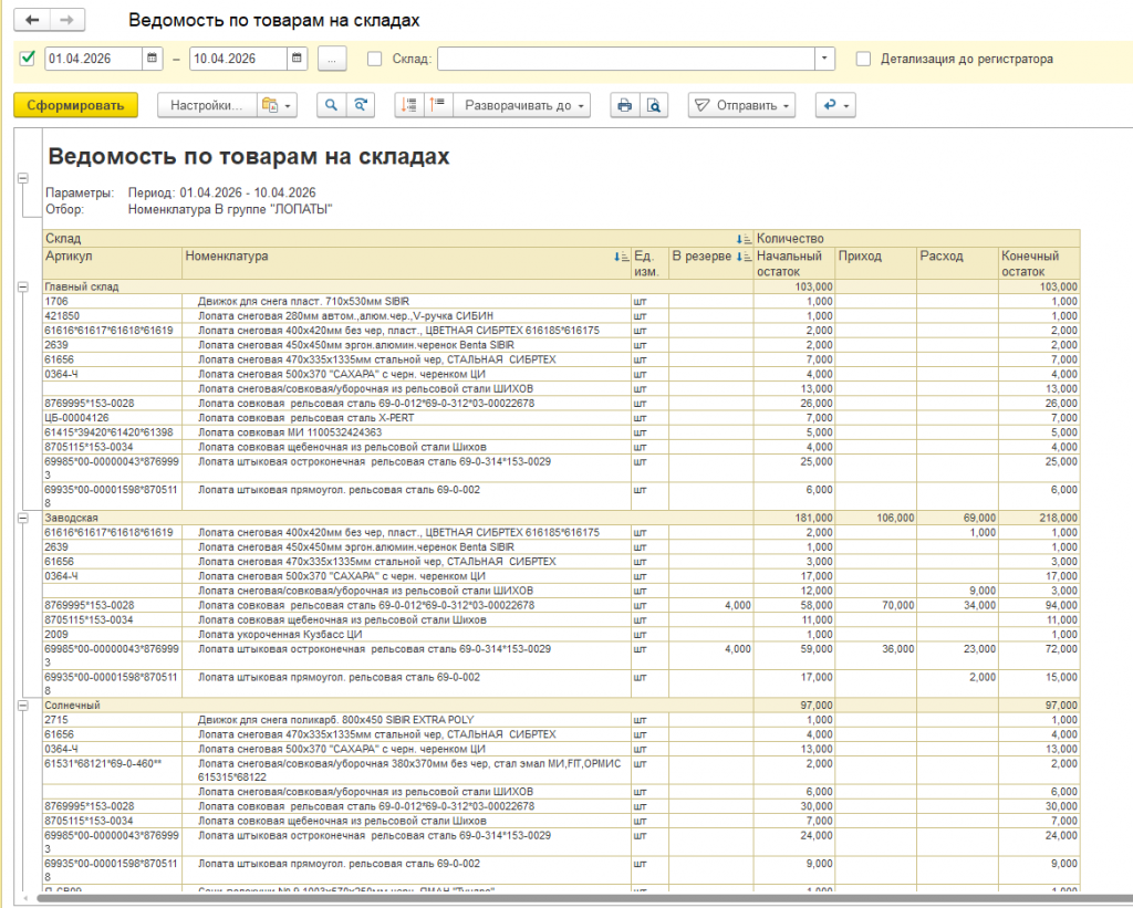 Ведомость по товарам на складах с отображением резервов УТ 11.5 / КА 2.5 / ERP 2.5