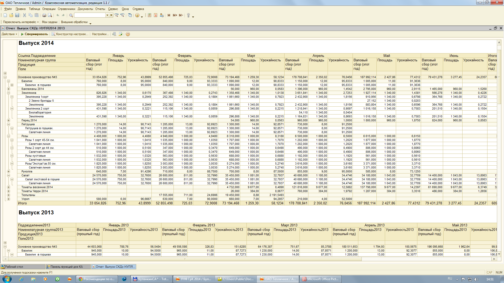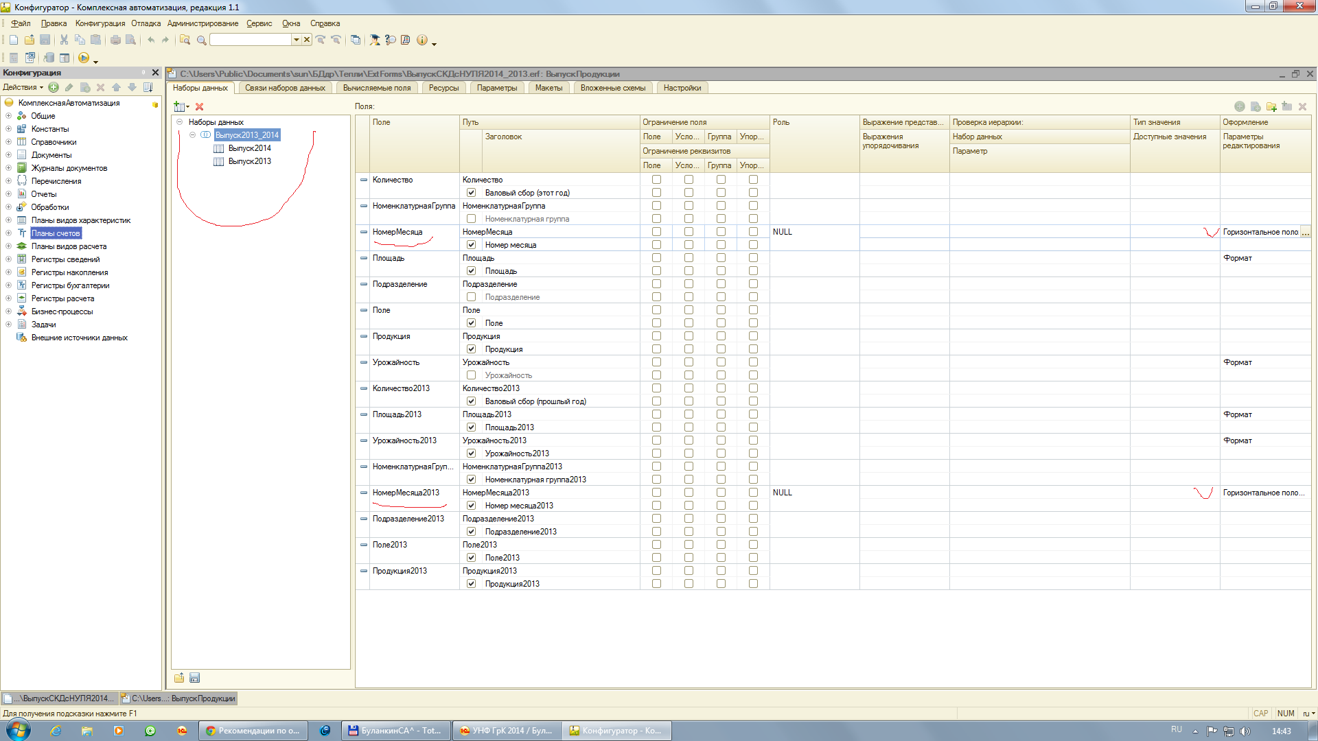 У экономистов, как правило, ОЧЕНЬ большие формы для План -Фактного анализа текущего года с прошедшим, где вычисляются ОТКЛОНЕНИЯ. Исходным методом разработки отчета явился Макет (на рисунке это"Макет") экономиста, в который необходимо вывести данные за полугодие текущего и прошедшего годов. В макете две таблицы, каждая на соответствующее полугодие и плюс строка Отклонение. 1-й - вариант отчета с помощью Запроса собирает данные, а потом с помощью ТаблицЗначений все компонуется по месяцам (позднее этот громоздкий отчет родил "оптимизированный" отчет с рекурсиями и присоединением колонок (месяц), который в данной публикации не выкладывается, да и не этот вариант главный). Главный бухгалтер увидев этот отчет у экономиста "вежливо попросил" создать отчет с 2 мя таблицами по полугодиям (оба отчета за любой период) и строкой "Отклонение", но по форме, и он(а) показала типовой отчет "........." сформированный в СКД. Так как Макет экономиста "втаскивать" в макет СКД не обязательно, то и появился вариант 2-го отчета на СКД, который тоже стал использовать и экономист. Экономисту очень понравилось "сворачивать" и "разворачивать" группировки: отчет, то становился большим, то компактным, то опять большим. В публикации 2-й вариант отчета на СКД и тоже промежуточный. Выложены они, скорее, как эскизы. Для экономии СтартМани я их объединил в архив - в 1-м отчете макет по реальной форме отчета экономиста. Отчеты для не типовой КА, поэтому ЗапросПоРегистрам пришлось заменить на Запрос по табличной части документа ВыпускПродукции. Почему выкладываю варианты внешних отчетов, а не излагаю все в статье, да все просто - лучше один раз увидеть и пощупать. При создании отчета пришлось столкнуться с вариантом План-Фактного отчета экономиста и его заполнить (в муках), решение этого же вопроса с помощью СКД, где пришлось разбираться с выводом 2-х таблиц по годам и выводом ПО МЕСЯЧНО данных, и работа с отклонением. Был выбор как собирать данные: а)Набор данных Запрос; б)Набор данных Объект, ........ я использовал вариант: Набор данных Объединение, может потому что через вариант а) "криво" получилось. Да и много нюансов в СКД, которые не видны, но оказывают большой эффект на отчет. На отчетах-эскизах можете "пытать" СКД и наблюдать за поведением выводимой информации в отчет.