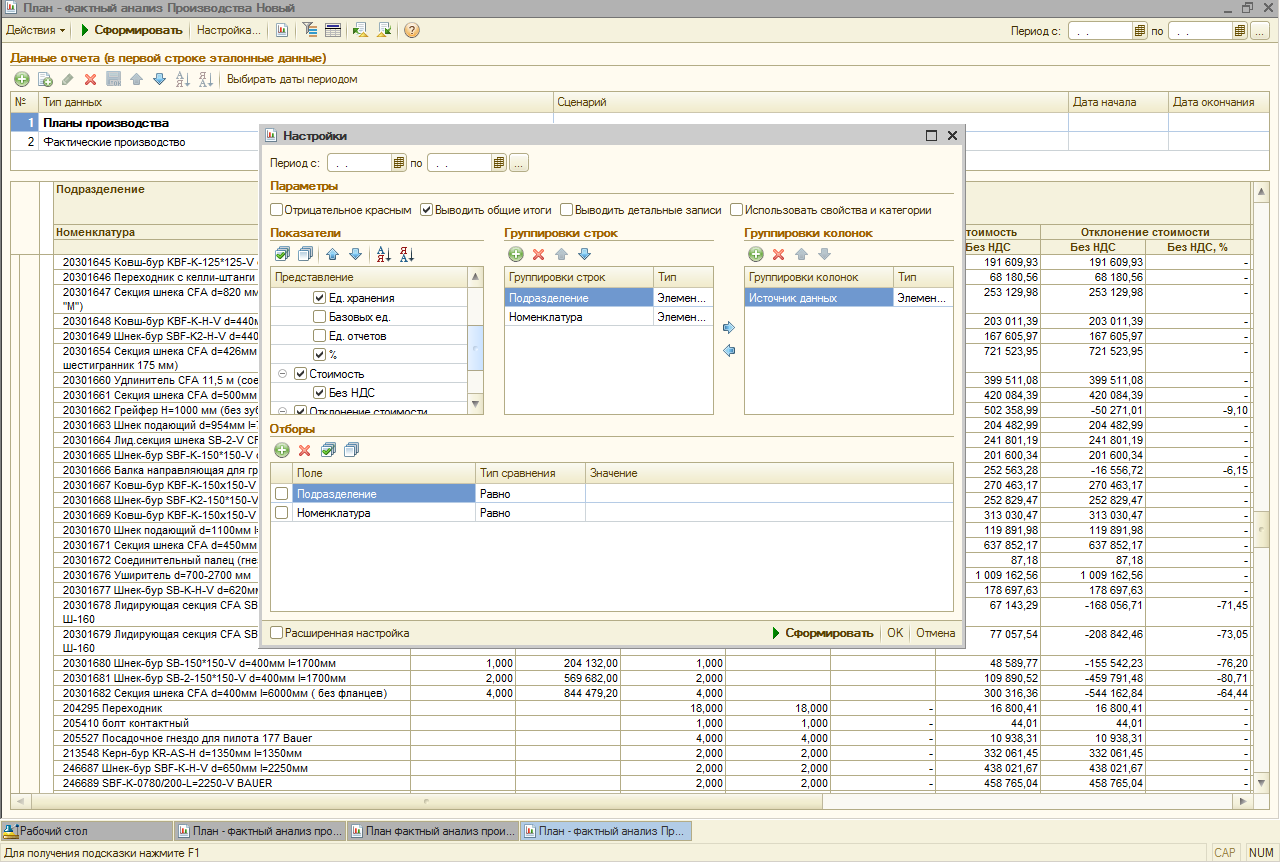 1. Первый отчет "План-фактный анализ производства" для УПП сделан на основе типового отчета в УПП (использовала универсальный отчет вместо СКД, сделано по аналогии отчета "План-фактный анализ продаж"). Настройки остались те же, но в более удобном виде, и появился отбор по периоду.