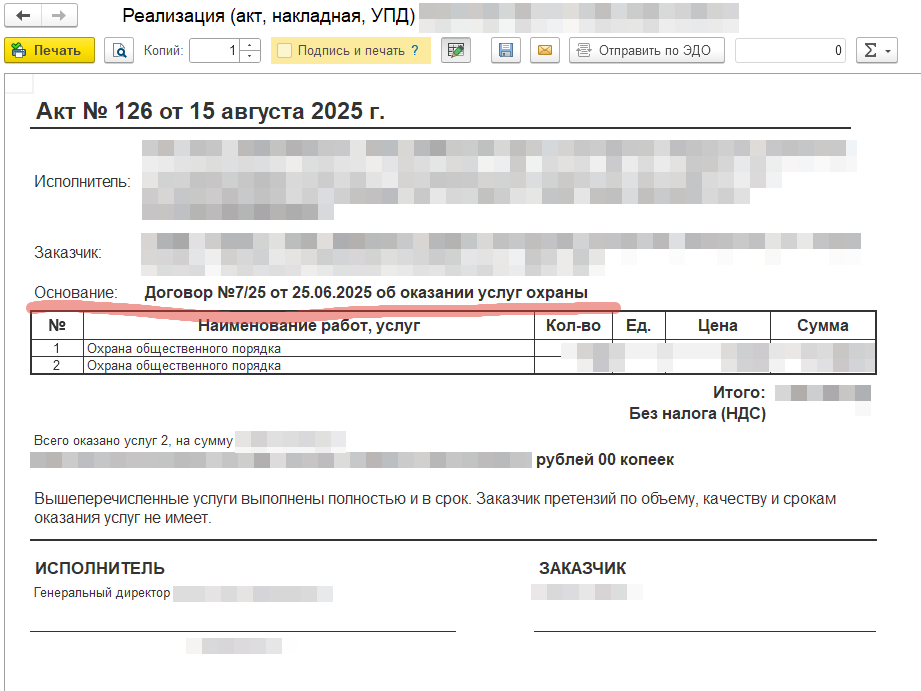 - Акт об оказании услуг для документа Оказание услуг, Реализация товаров и услуг