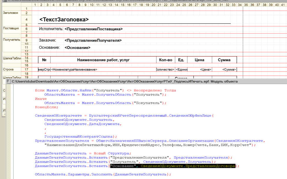 Как и в типовом механизме для печати Акта об оказании услуг используются разные макеты.