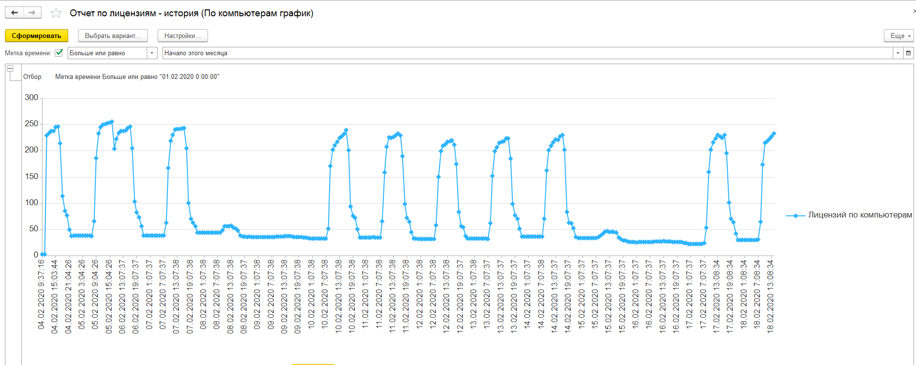 По данным формируем отчет на скд. Он сгруппирован по компьютерам, можем даже посчитать перерасход лицензий