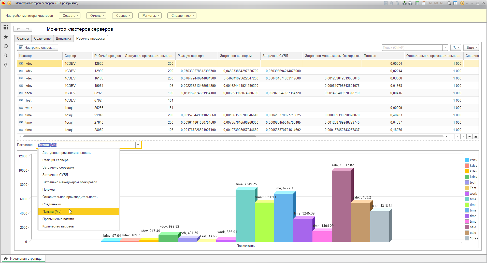 Под показатели рабочих процессов выделены отдельные регистры хранения со своей аналитикой. Можно использовать для оптимизации настроек кластера.