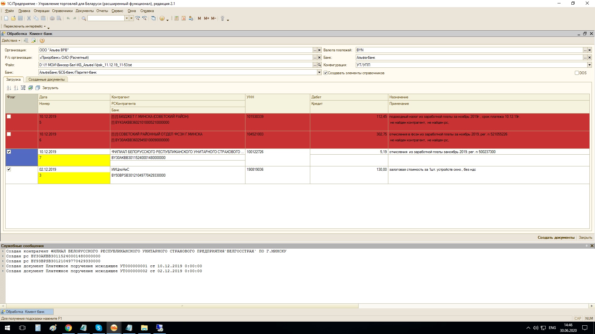 2. После указания всех параметров нажимаем кнопку - Загрузить, происходит чтение данных из файла выписки в табличную часть обработки. Красная индикация строк указывает на, то что при чтении выписки некоторые элементы справочников не были найдены, рябом с ними можно видеть восклицательный знак. Желтая индикация номеров обозначает, что дынный платеж уже ранее был загружен в базу 1С8.