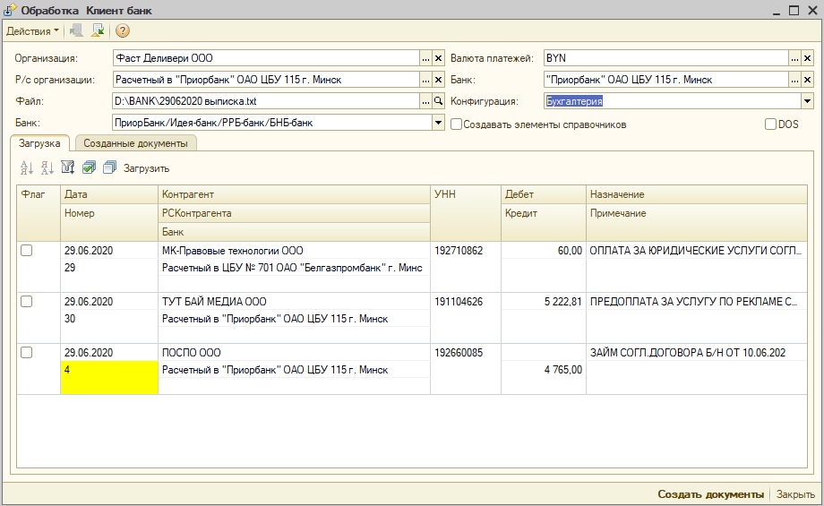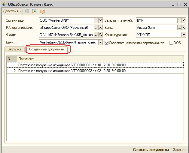 5. Просмотреть созданные документы можно перейдя на вкладку обработки - Созданные документы. Или же открыв типовой журнал - Банковские платежные документы.