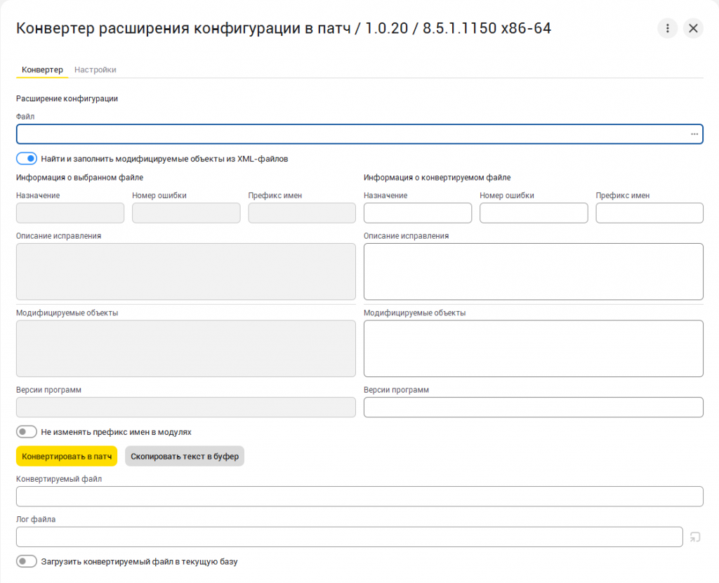 Предлагаю обработку, которая умеет конвертировать из любого расширения конфигурации в патч с новым произвольным номером ошибки, внутренними уникальными идентификаторами и идентификатором патча. Протестировано на платформах 8.3.27.1989 и 8.5.1.1150.