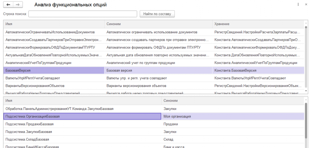 - Обработка показывает все функциональные опции с возможностью поиска по реквизитам объектов метаданных, а также открытие этой ФО через интерфейс обработки