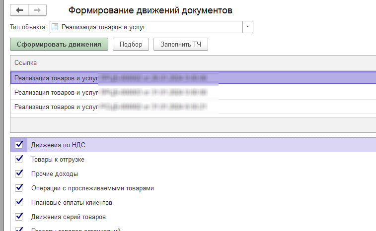 - Формирование движений документов. Работает через механизмы проведения ERP. Обработка не перепроводит документы, а формирует движения напрямую в регистр.