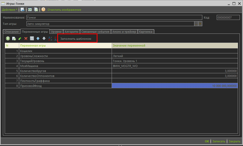 На закладке «Переменные игры» заполним таблицу переменных шаблоном.