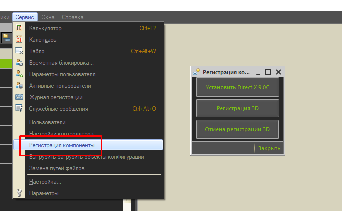 После этого, запустить 32-х платформу 1С под правами администратора и установить DirectX 9.0C с управляемым кодом и саму визуальную компоненту. В штатном режиме оба компонента встают автоматически, по завершении инсталляции, необходимо нажать кнопку «ОК». Вручную установить/деинсталлировать компоненты можно в меню «Сервис».