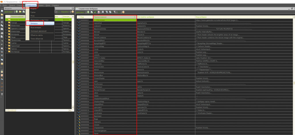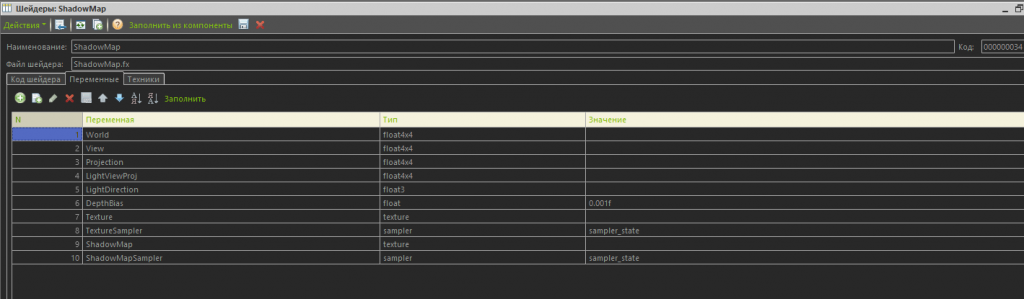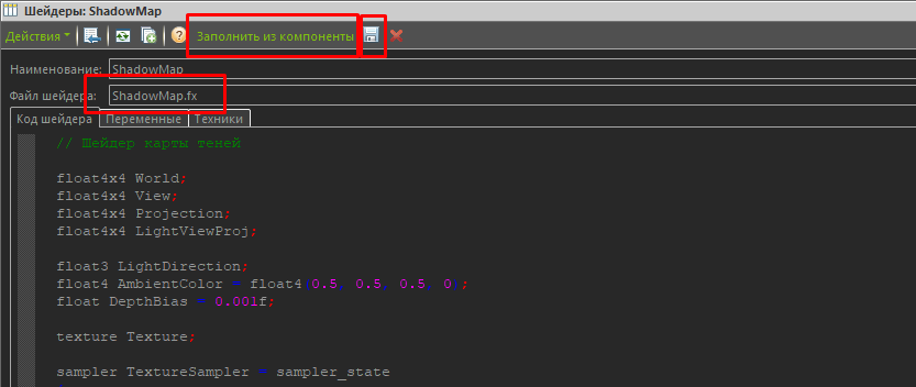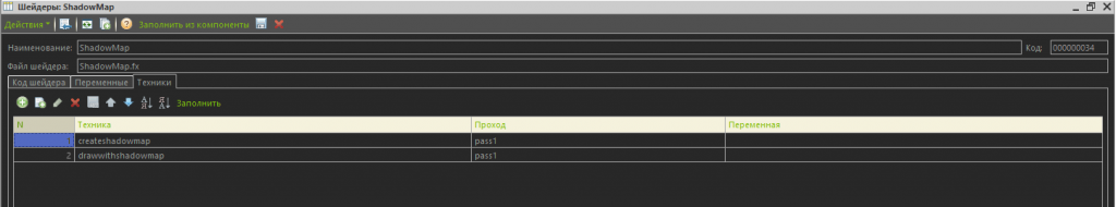 Рассмотрим закладки на форме: «Код шейдера», «Переменные» и «Техники»