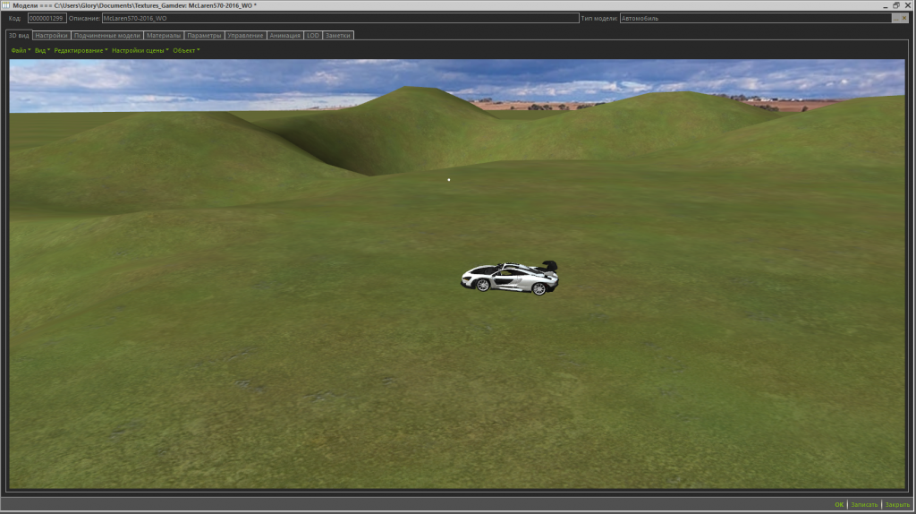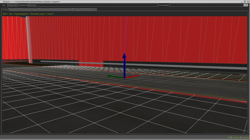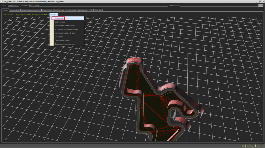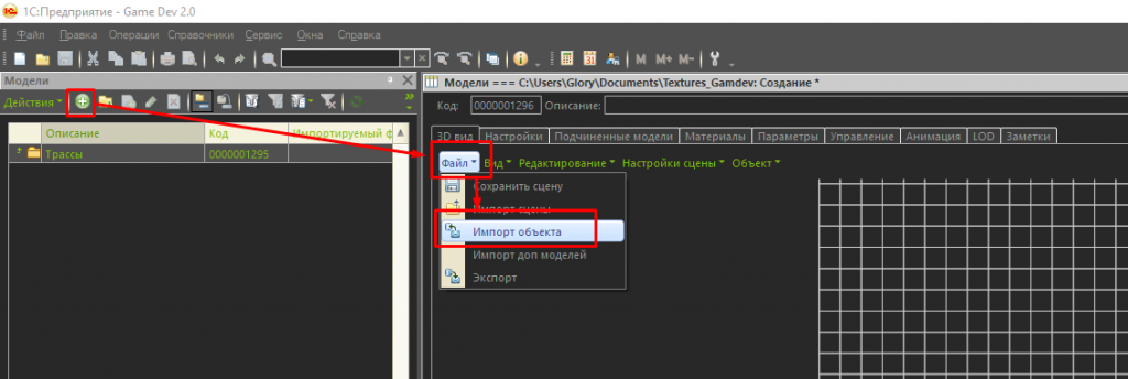 Внутри группы создаем новый элемент, сразу открывается окно с трехмерной областью и через пункт меню «Импорт объекта», загружаем трассу.