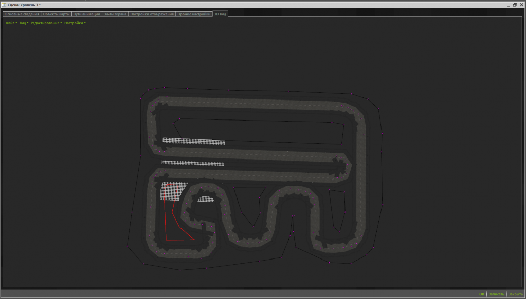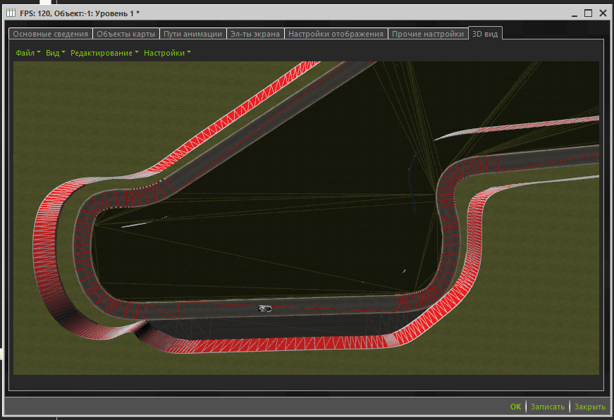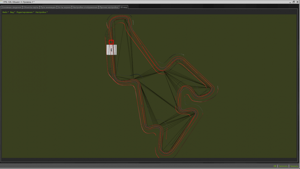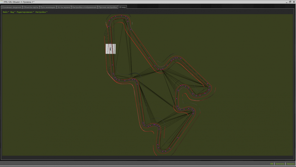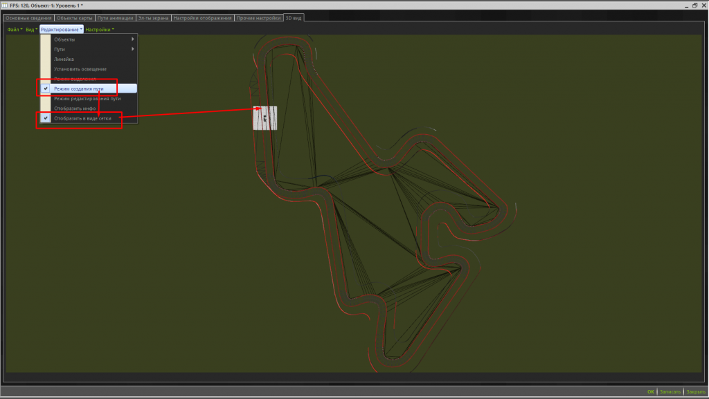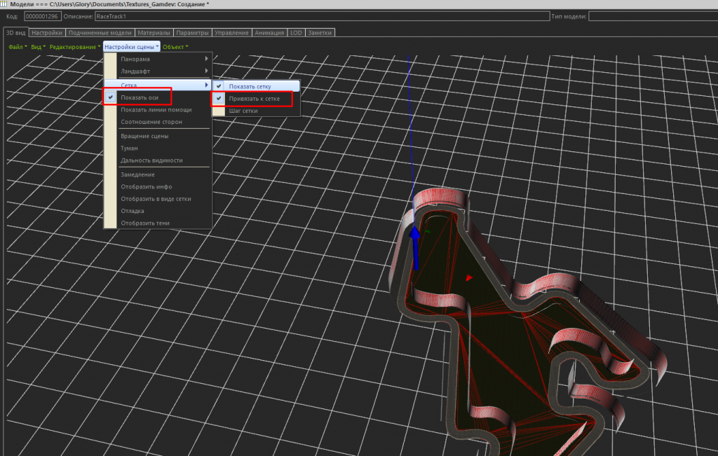 Перемещаем мышью, зажав Ctrl объект так, чтобы начало трассы совпало с началом координат. Для отключения привязки к сетке и вывода осей координат, необходимо выбрать соответствующие пункты меню «Настройки сцены».