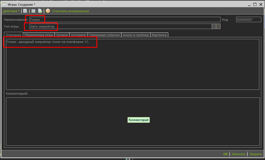 Заполним тип игры и описание, которое будет появляться в общем меню выбора игр.