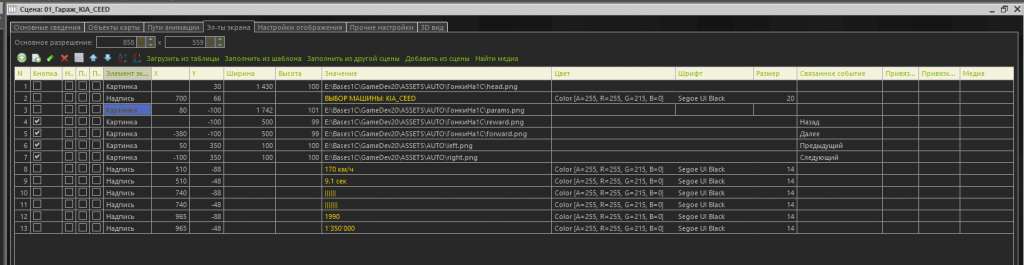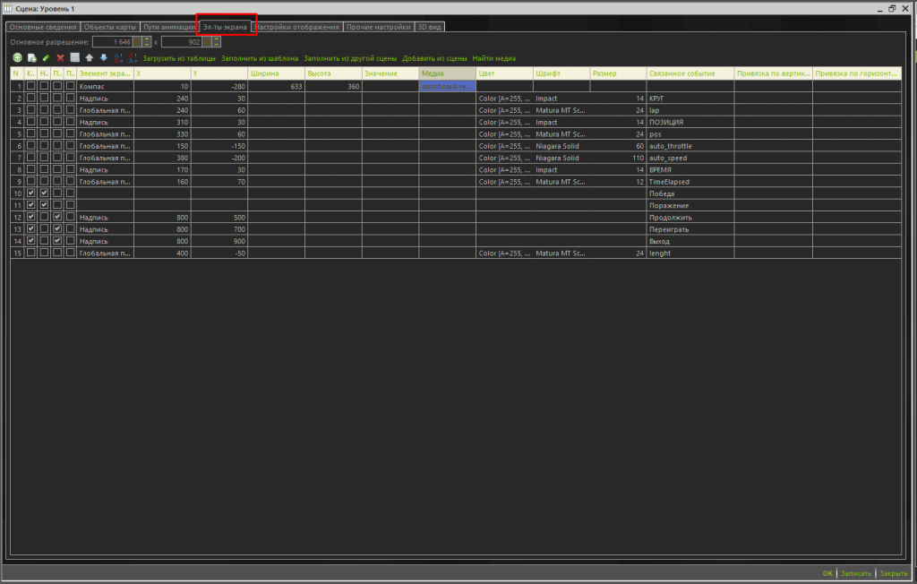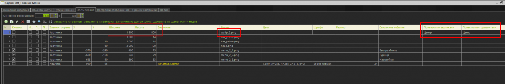 Затем введем 2D элементы меню. Доступны как текстовые значения, так и выбор значений из справочника Мультимедиа, если это картинка или фон.