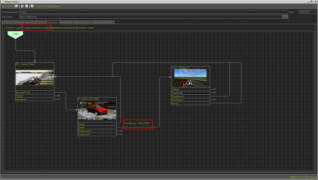 На закладке Алгоритм происходит основная работа с логикой, т.к. именно здесь устанавливаются связи между уровнями и происходит визуальное описание.