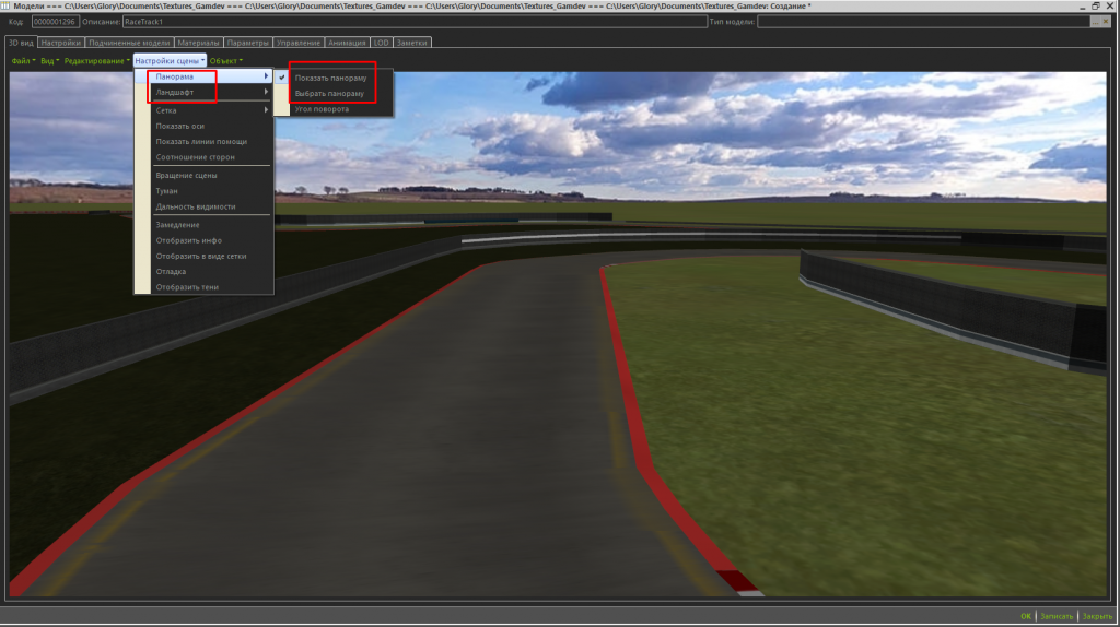 Также, для того чтобы посмотреть, как выглядит трасса с небом, можно включить отображение панорамы. По умолчанию будет отображаться встроенная текстура панорамы. Ее можно поменять на любую другую, а также изменить угол поворота. Загружать нужно текстуру, снятую в сферическом формате 360, расширение файла — любое графическое. Там же меняется и текстура ландшафта. Его можно закачать из ранее сохраненного файла ландшафта, либо загрузить из карты высот.