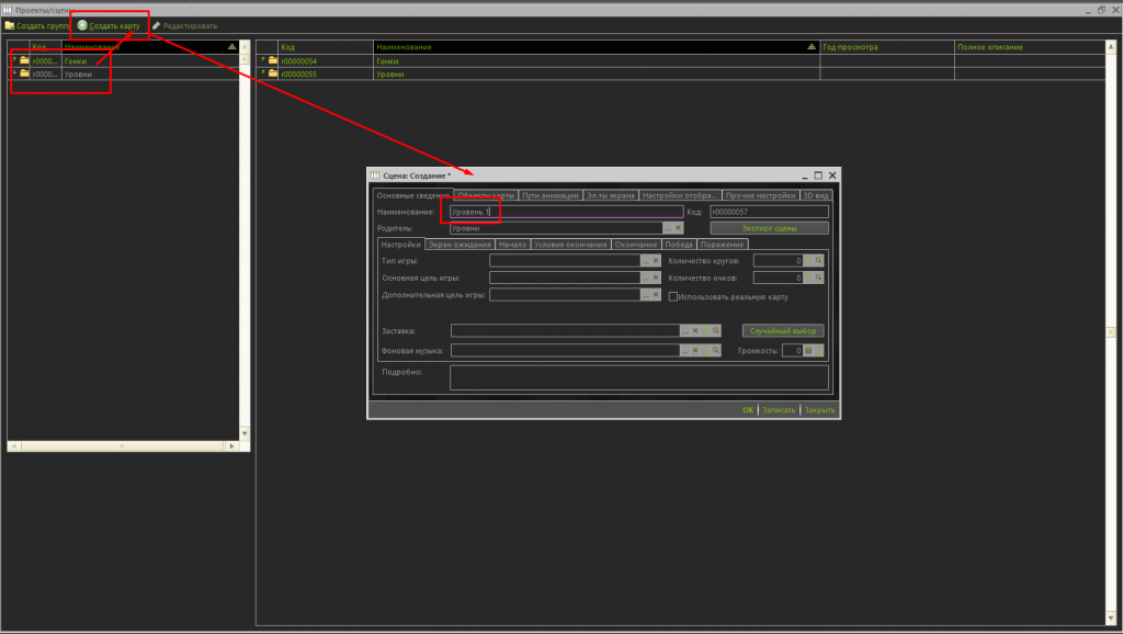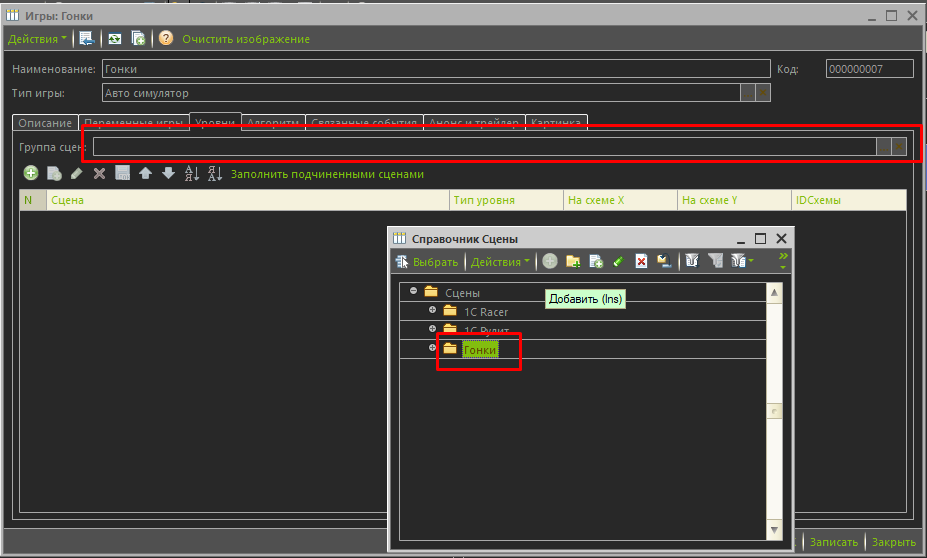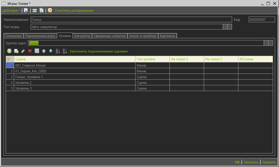 По завершении редактирования алгоритма, и при записи элемента игры в базу, он будет автоматически переведен в таблицу связей всех уровней.