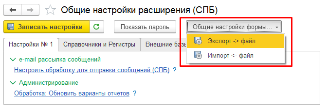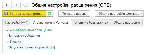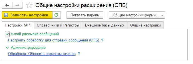 "Настроить обработку для отправки сообщений (СПБ)" - Позволяет прописать список почтовых адресов, для отправок и приема почтовых сообщений.