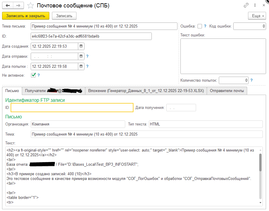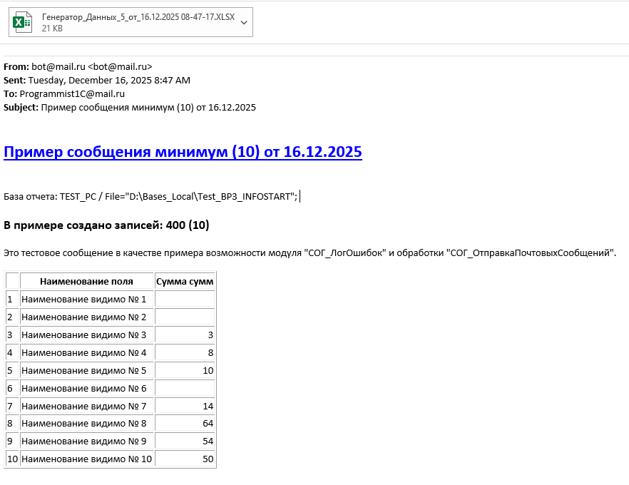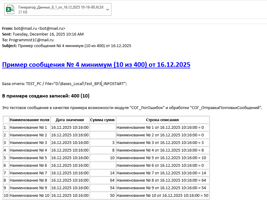 в. "СОГ_ЧтенияПочтыПоЯщику_Пример.epf" - пример позволяет читать входящую почту, формировать сообщения для отправки по регламенту, работать с 7zip архивами и обрабатывать файлы EXCEL, средствами самого Excel-я.