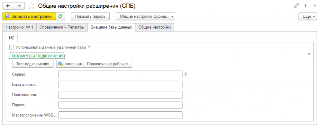 // стрОснПарамОбр - Параметр для подключения, структура вида: "Сервер,БазаДанных,Пользователь,Пароль,МестоположениеWSDL"