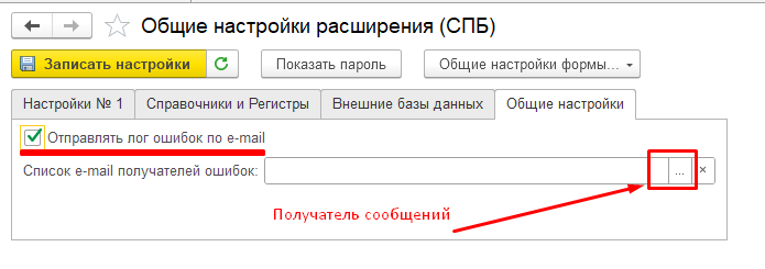 общие настройки для расширения, в данном варианте это настройка списка адресов для получения уведомлений о ошибках.