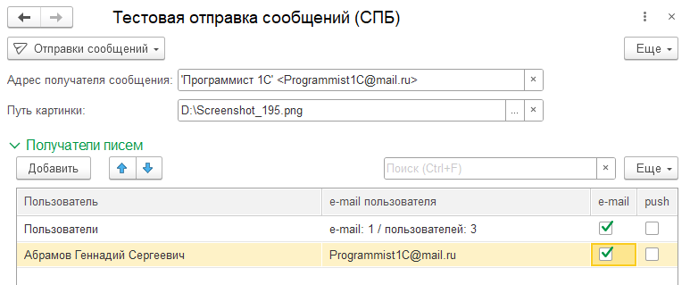 б. "СОГ_РазослатьКонтрагентамПечатнуюФормуПоСчету.epf" - пример отправки почты пользователем. Позволяет по документу "Счет покупателю" отправлять письма контрагентам с вложением печатных форм. (В примере рассмотрен вариант одной произвольной печатной формы документа, включая внешних)