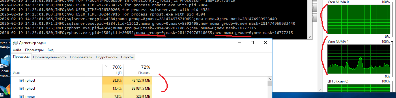 (1)Вечер добрый. Когда все rphost'ы на одной Numa группе, которая в итоге загружена в 100% cpu, а вторая группа загружена на 5-10% - какое тут может быть нагрузочное тестирование? Доходит до того, что снимаются дампы с нулевым смещением из-за фриза рабочих процессов. Отдаем себе отчёт, что переключение thread не бесплатно, поэтому в планах внедрить более интеллектуальное переключение.