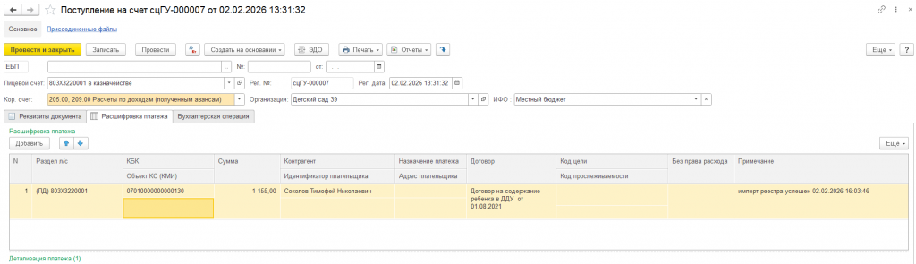 Пример сформированного документа кассового поступления - все заполняется автоматически: галочка, счета, табличная часть, бухгалтерская операция. Документ может формироваться как с нуля, так и на основе уже сформированных кассовых поступлений, загруженных из СУФД. Все сделано для облегчения разноски родительской платы. Особенно для централизованных бухгалтерий.
