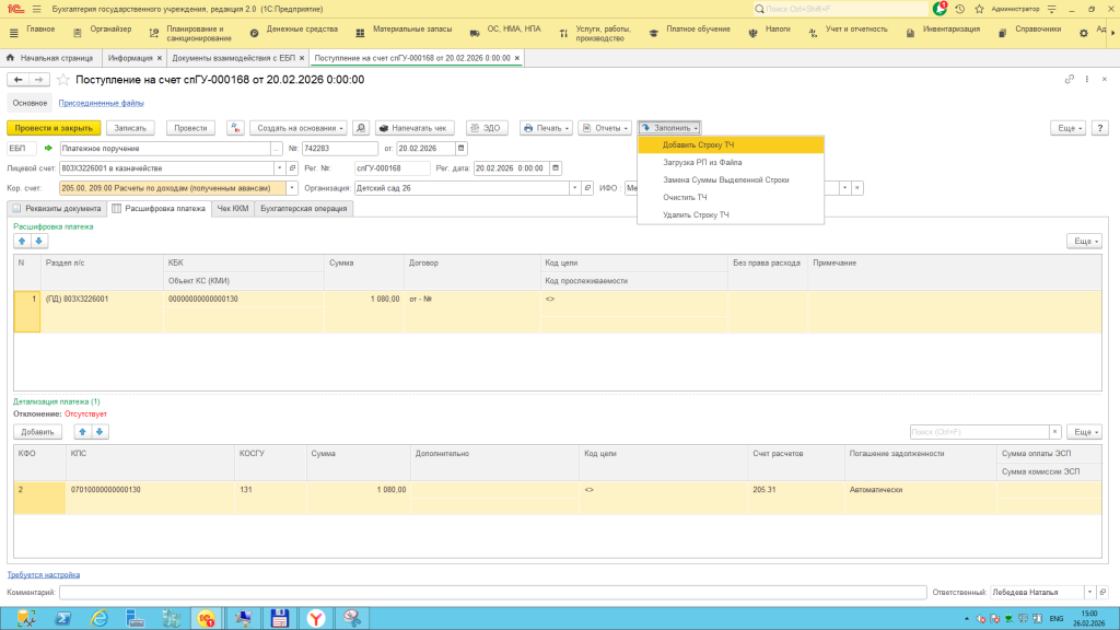 В связи с необходимостью правки (а поступившие из ЕБП документы не редактируются) поступлений на лицевой счет из ЕБП была произведена доработка, теперь можно добавлять, удалять строки табличной части документа. При этом автоматически заполняется детализация.