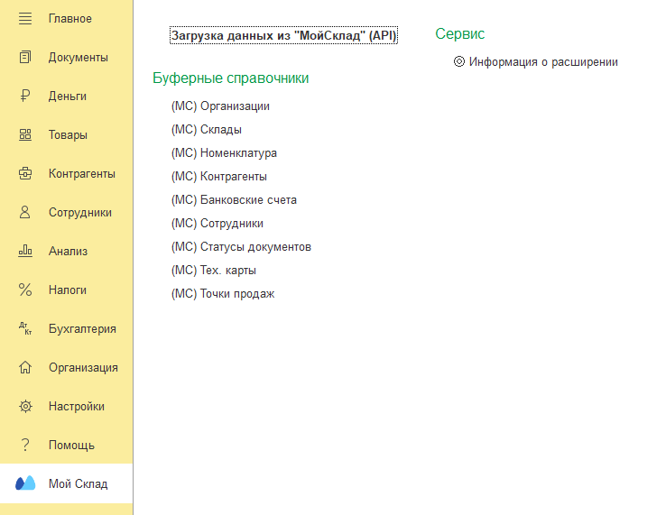 Перенос справочников сделан через буферные справочники, специально созданные в расширении. Использование буферных справочников позволяет сопоставить элементы из Моего Склада с уже заведенными элементами в Бухгалтерии для того, чтобы избежать возникновения дублей элементов.
