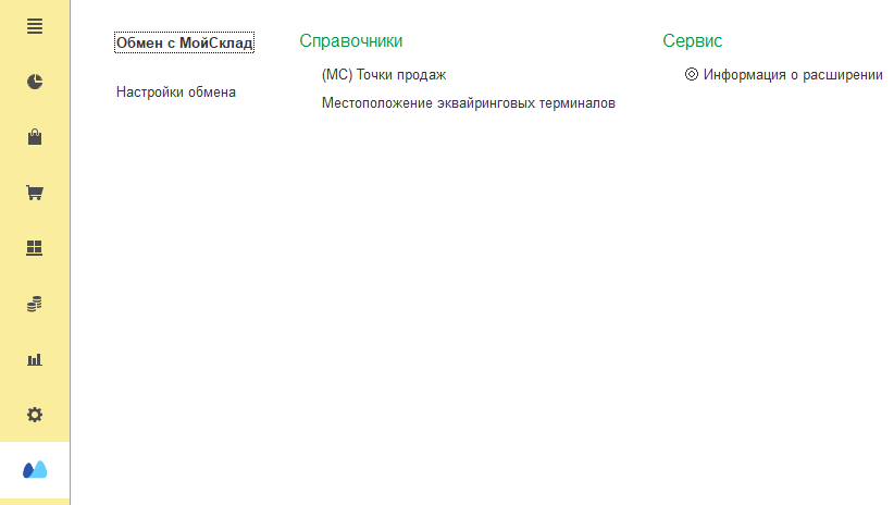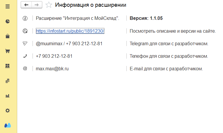 Расширение реализует обмен с МойСклад (http://moysklad.ru) через JSON API 1.2. Загружает данные из системы "Мой Склад" в 1С. Загружаются справочные данные (Организации, Склады, Контрагенты, Номенклатура) и документы (Закупки, Продажи, Склад). Поддерживается повторная загрузка данных.