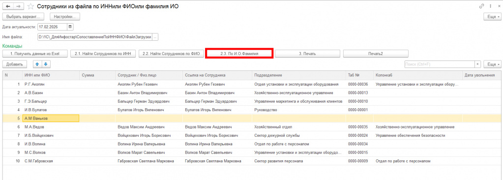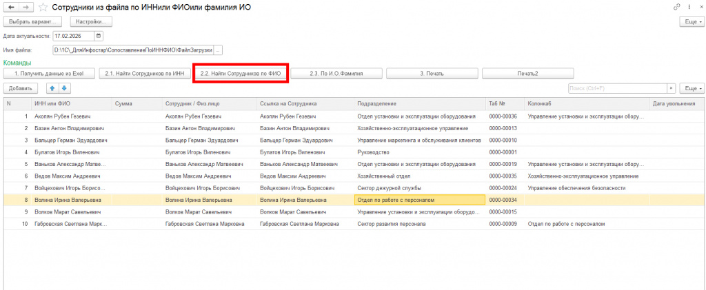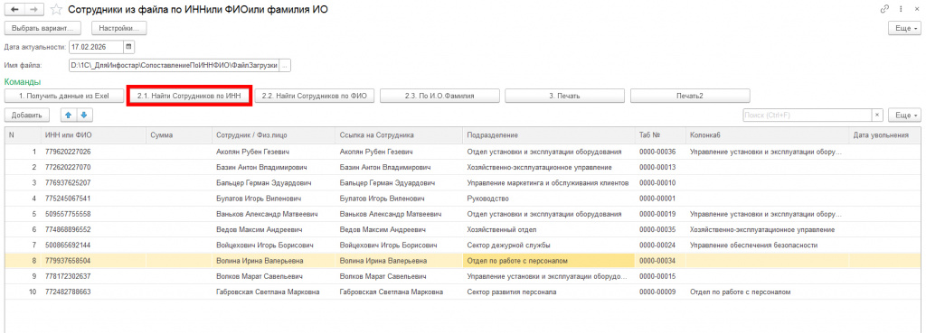 Данная обработка загружает данные из файла и сопоставляет по ИНН или ФИО Сотрудников с подразделениями.