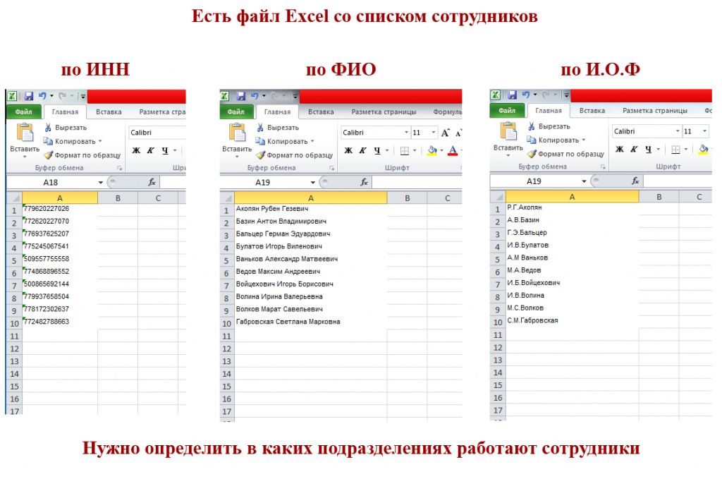 Если у Вас есть список ФИО или И.О. Фамилия или ИНН вставьте его в первый столбец Excel.