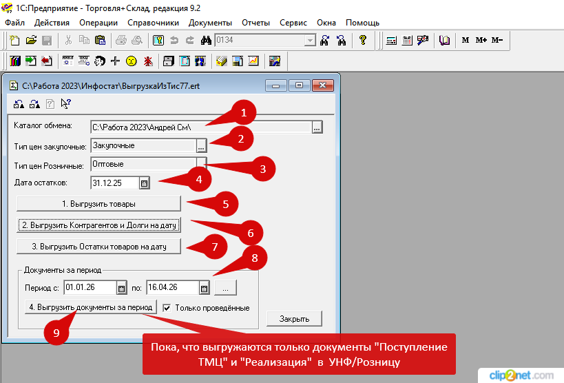 * Обработка выгрузки была создана на платформе 1С Предприятие 7.7 и версии конфигурации ТиС 7.70.994.
