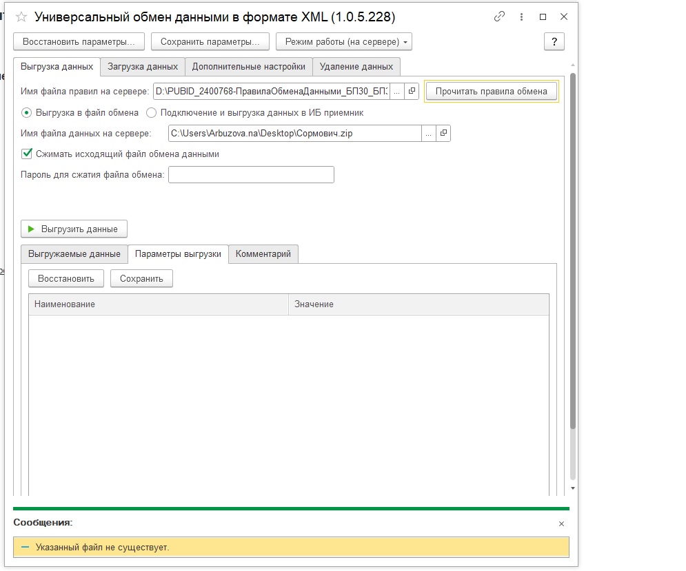 Переключаемся на вкладку "Параметры выгрузки", выставляем дату остатков, выбираем организацию.