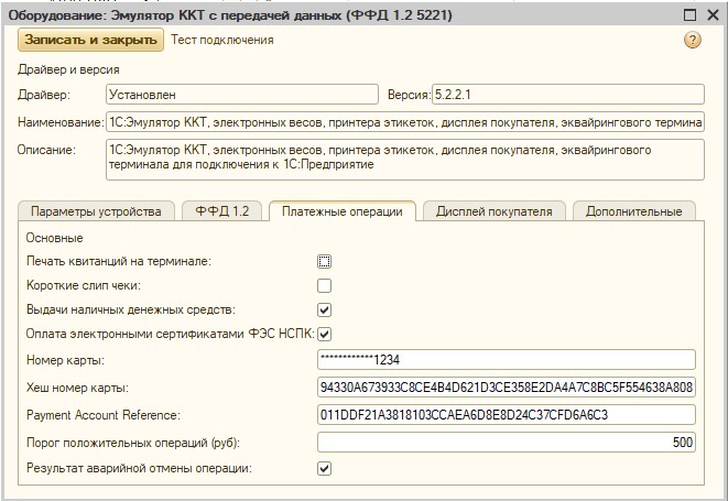 Внешняя обработка обслуживания торгового оборудования "Эмулятор ККТ ФФД 1.2" для конфигураций 1С на обычных формах - УТ 10.3, УПП 1.3, Розница 1.0. Поддерживаются ставки НДС 5%/7%, отображение признака проверки разрешительного режима, признак продажи в интернет (OperationOnline - тег 1125), часовая зона (TimeZone - тег 1011).