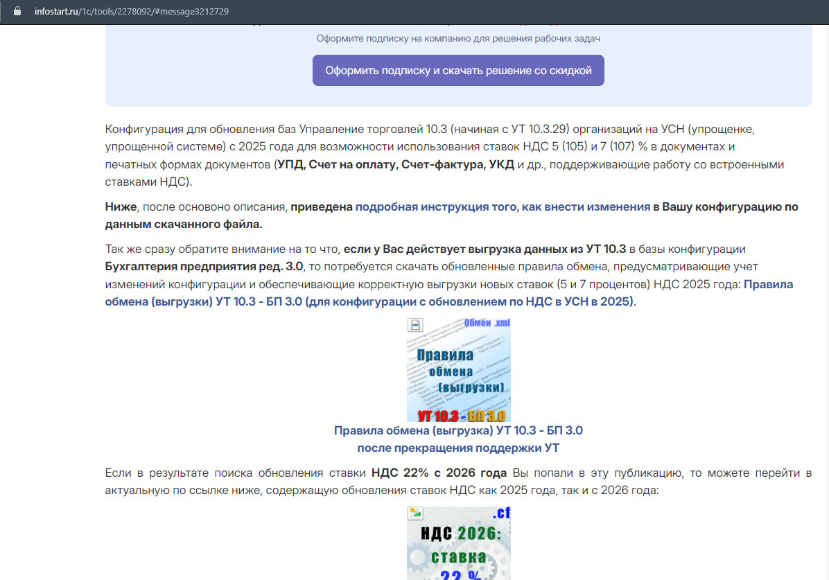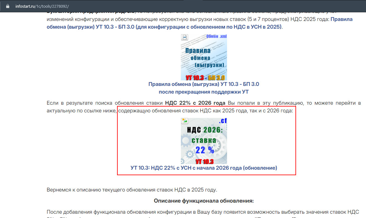 Так же сразу обратите внимание на то что, если у Вас действует выгрузка данных из УТ 10.3 в базы конфигурации Бухгалтерия предприятия ред. 3.0, то потребуется скачать обновленные правила обмена, предусматривающие учет изменений конфигурации и обеспечивающие корректную выгрузки новых ставок (5 и 7 процентов) НДС 2025 года: Правила обмена (выгрузки) УТ 10.3 - БП 3.0 (для конфигурации с обновлением по НДС в УСН в 2025).