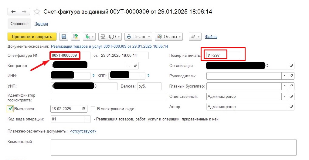 Добрый день! Номер на печать (ПредставлениеНомера) у вас заполняется по типовому (У-297 вместо номера документа основания У-309). В ПФ СФ и УПД идет номер из реквизита Номер на печать без префикса организации и лидирующих нолей. Доработайте пжл этот момент.