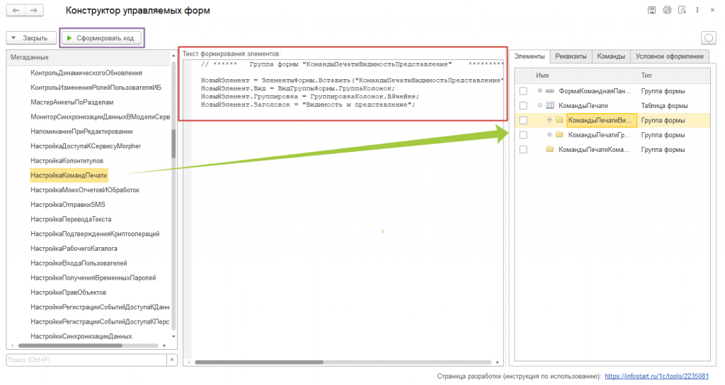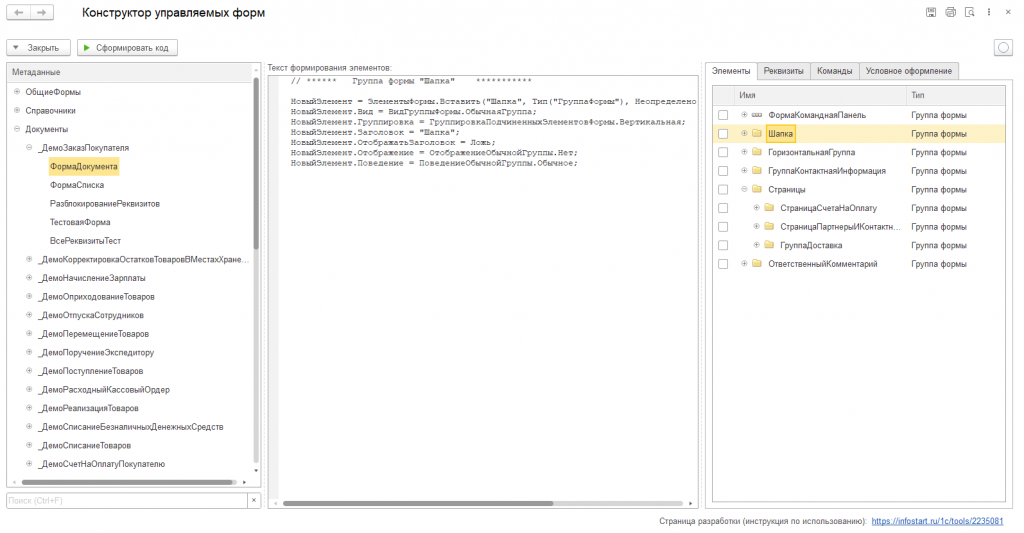 - Автоматизация создания кода программного добавления элементов форм. А также реквизитов, команд и элементов условного оформления.