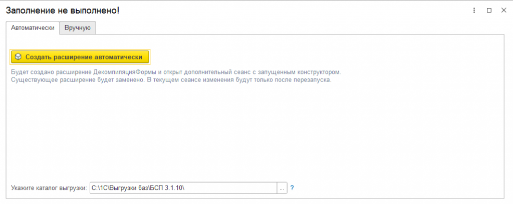 * Сразу откроется форма для автоматического создания расширения или добавления необходимого кода в ПриСозданииНаСервере модуля формы: