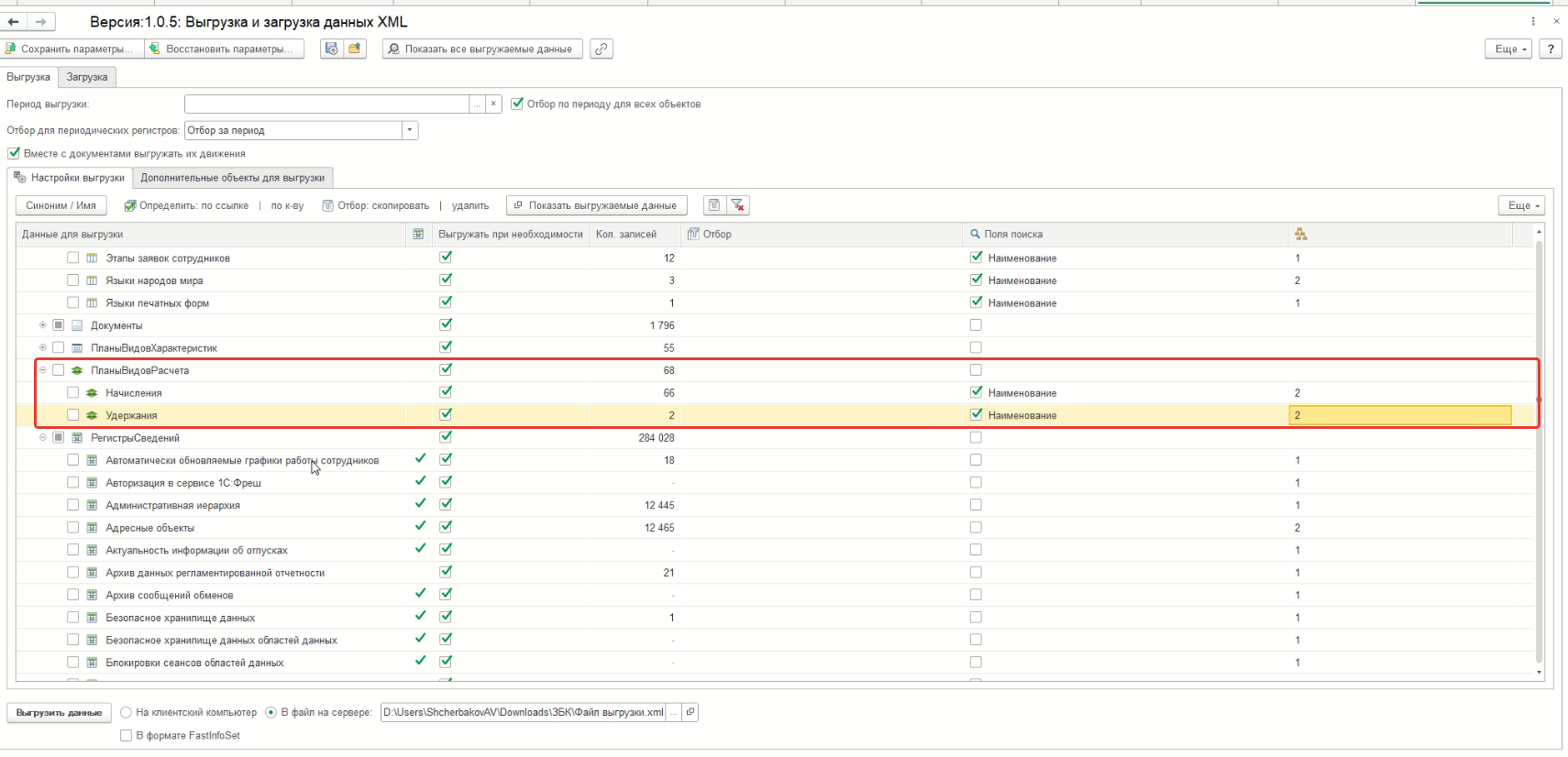 - Подсчет количества записей в таблицах: позволяет не тратить время на настройку выгрузки объектов, которые даже не будут выгружаться. Расчет количества записей производится по двойному клику в соответствующей колонке. При клике в конкретной строке метаданных выводится количество записей этой строки, при клике на типе метаданных (например, Документы) будет рассчитано количество всех вложенных строк;