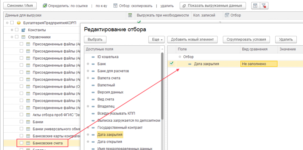 - Отбор по реквизитам выгружаемых объектов метаданных: выгружается не весь справочник (документ, регистр и т.д.), а только элементы, соответствующие отбору;