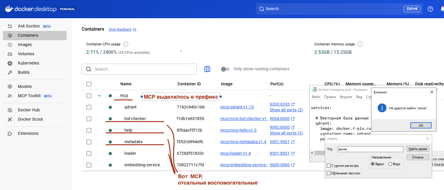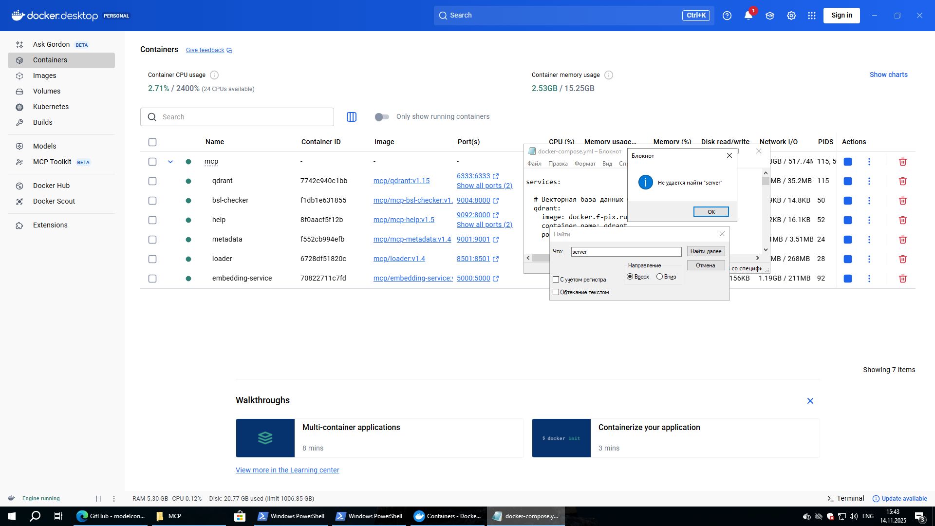 Нужна машинка с установленным Docker и Docker Compose. Я делал все на linux, но подозреваю, что и на современных Windows c WSL может сработать. Я сразу не рассматривал локальные MCP через STDIO, мне кажется, это не удобно, не универсально. И хотелось в дальнейшем начать наконец использовать старую nvidia 1070 на домашнем сервере. Поэтому сразу делал remote MCP, хотя с ними свои нюансы. В общем, запускать можно хоть на удаленной, хоть на локальной машине, просто протоклол у MCP будет streamable HTTP (или SSE для Copilot)
