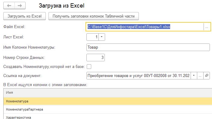 Данная обработка предназначена для загрузки в табличную часть «Товары» документов УТ 11 из таблиц Excel методом NativeXLSX. Т.е загружаются данные из файлов с расширением *.xlsx. Можно использовать для любого документа, содержащего табличную часть «Товары». Использовались обработки из Инфостарт. Например: "Импорт из EXCEL и др.источников (xls,xlsx,ods,sxc,dbf,mxl,csv,sql) в 1С": ru/public/120961/" href="//infostart.ru/public/120961/">//infostart.ru/public/120961/