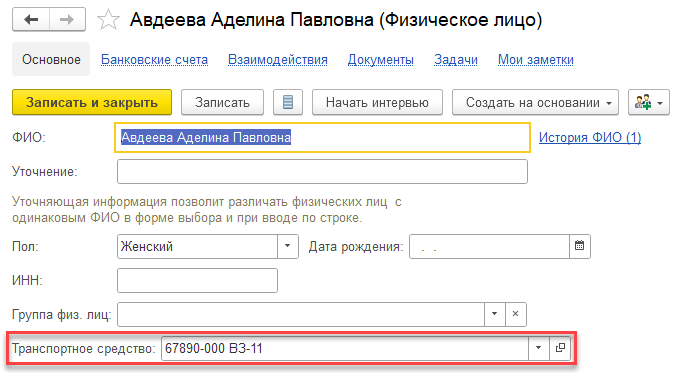 При первичном открытии любого документа транспортной накладной, будет создан дополнительный реквизит для справочника физические лица: транспортное средство.