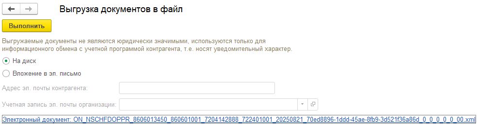 По нажатию кнопки "Выгрузить в XML" формируется xml-файл, содержащий УПД Документа. Отображается окно «Выгрузка документов в файл». Файл можно предварительно посмотреть, нажав на гиперссылку «Электронный документ…».
