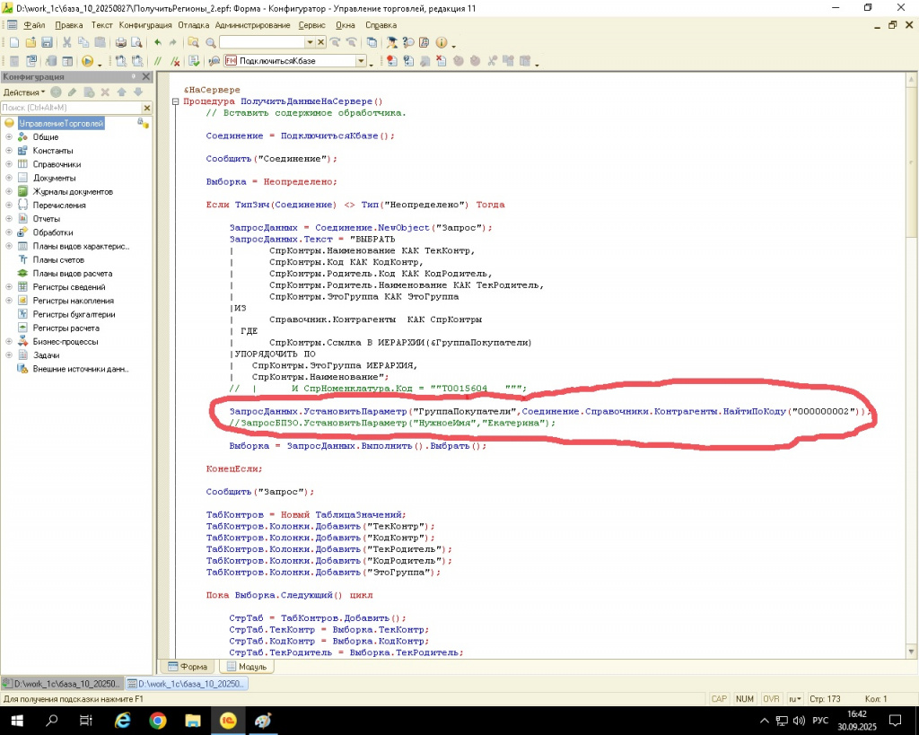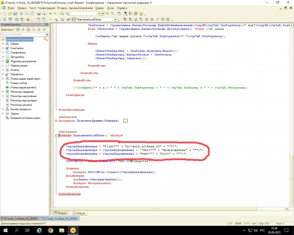 Перед запуском также необходимо через конфигуратор в коде обработки указать папку с покупателями в 10.3 и указать параметры прямого доступа к файловой базе 10.3 (путь, пользователя, пароль). На картинках выделено красным.